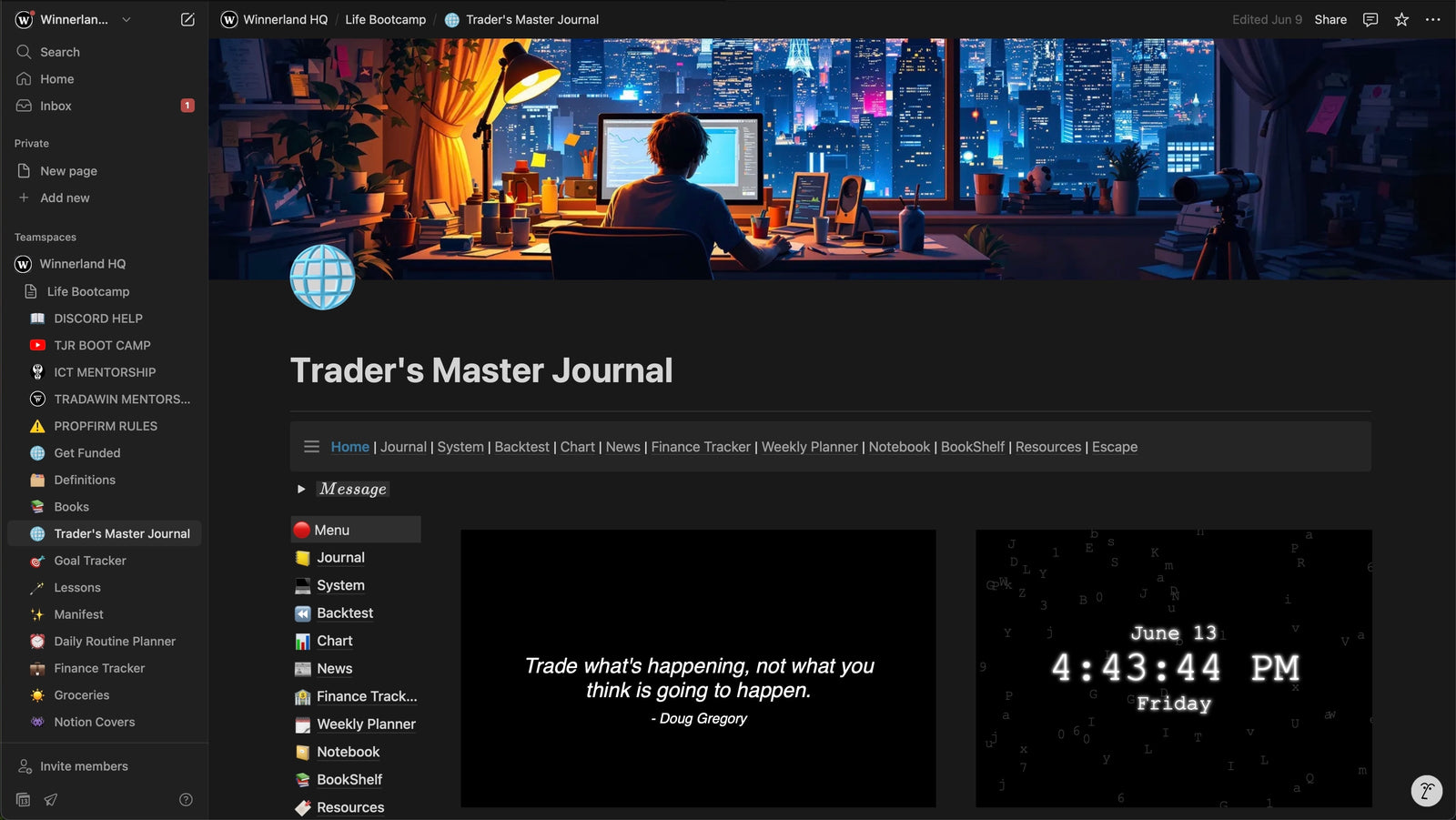 Access your trading notes, journal, planners, definitions, downloadable books, and extra resources — all organized inside one clean Notion workspace designed to keep your learning clear and structured.